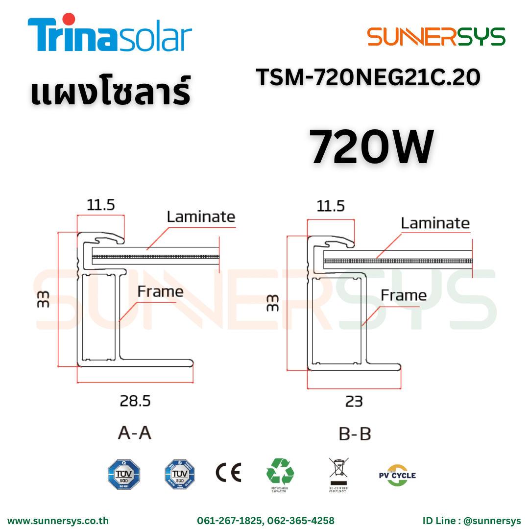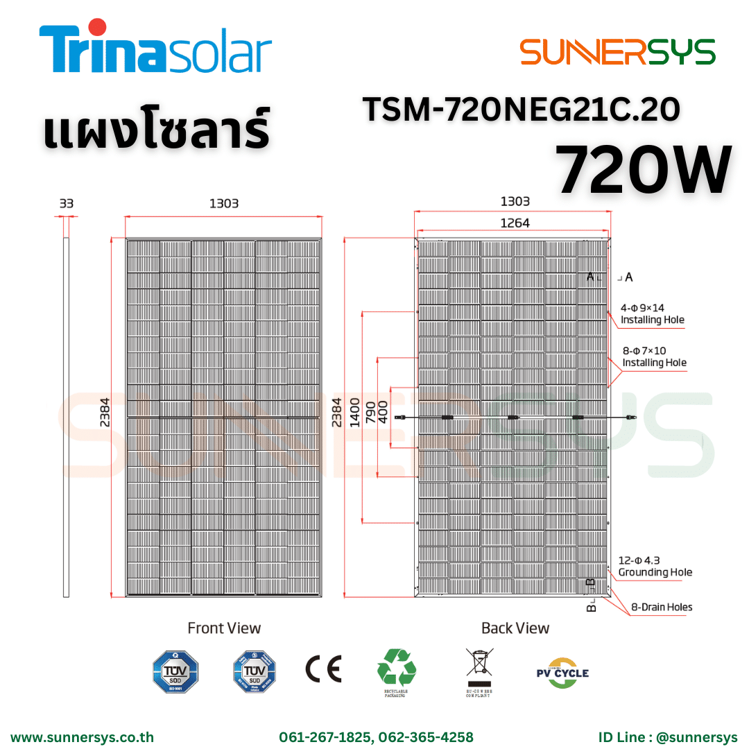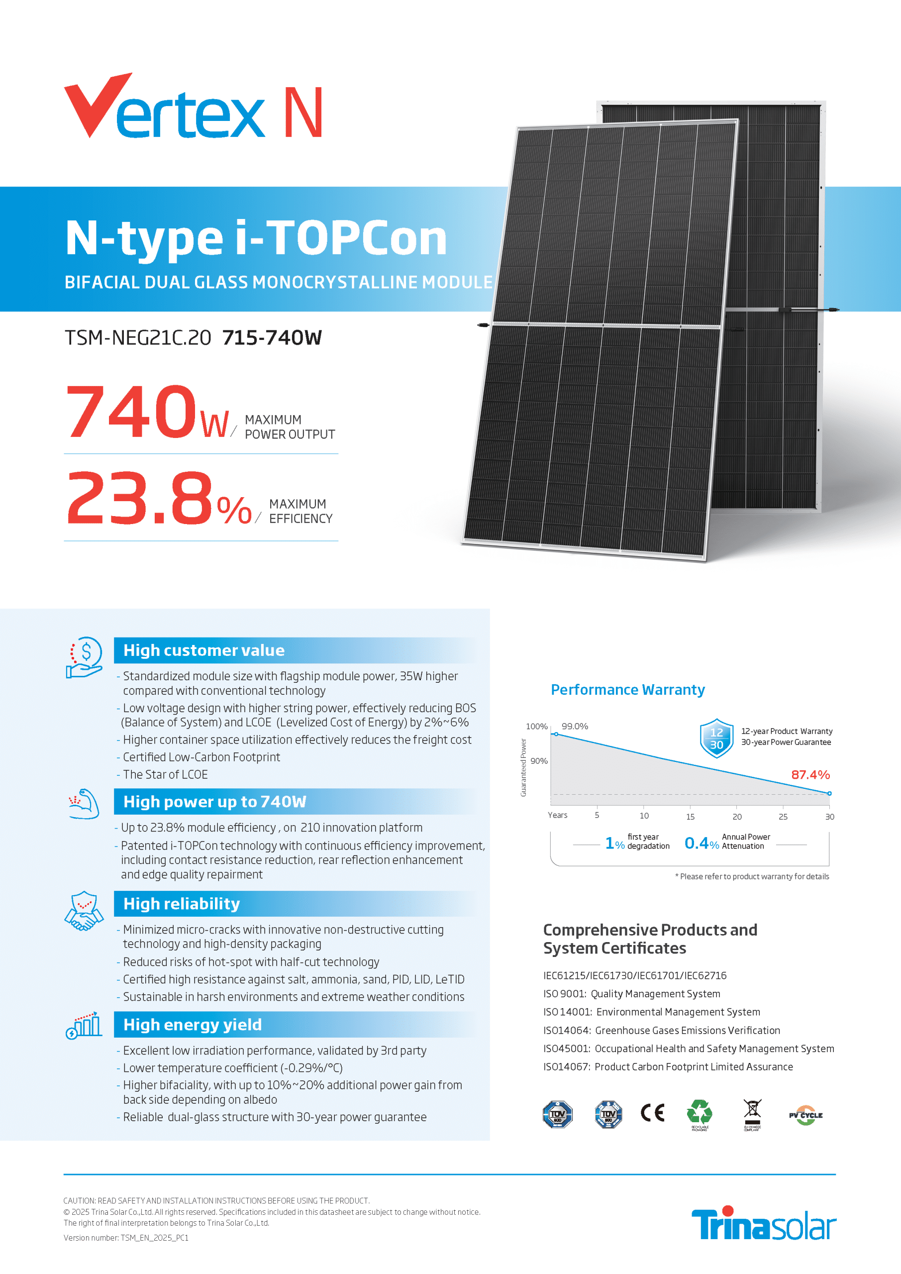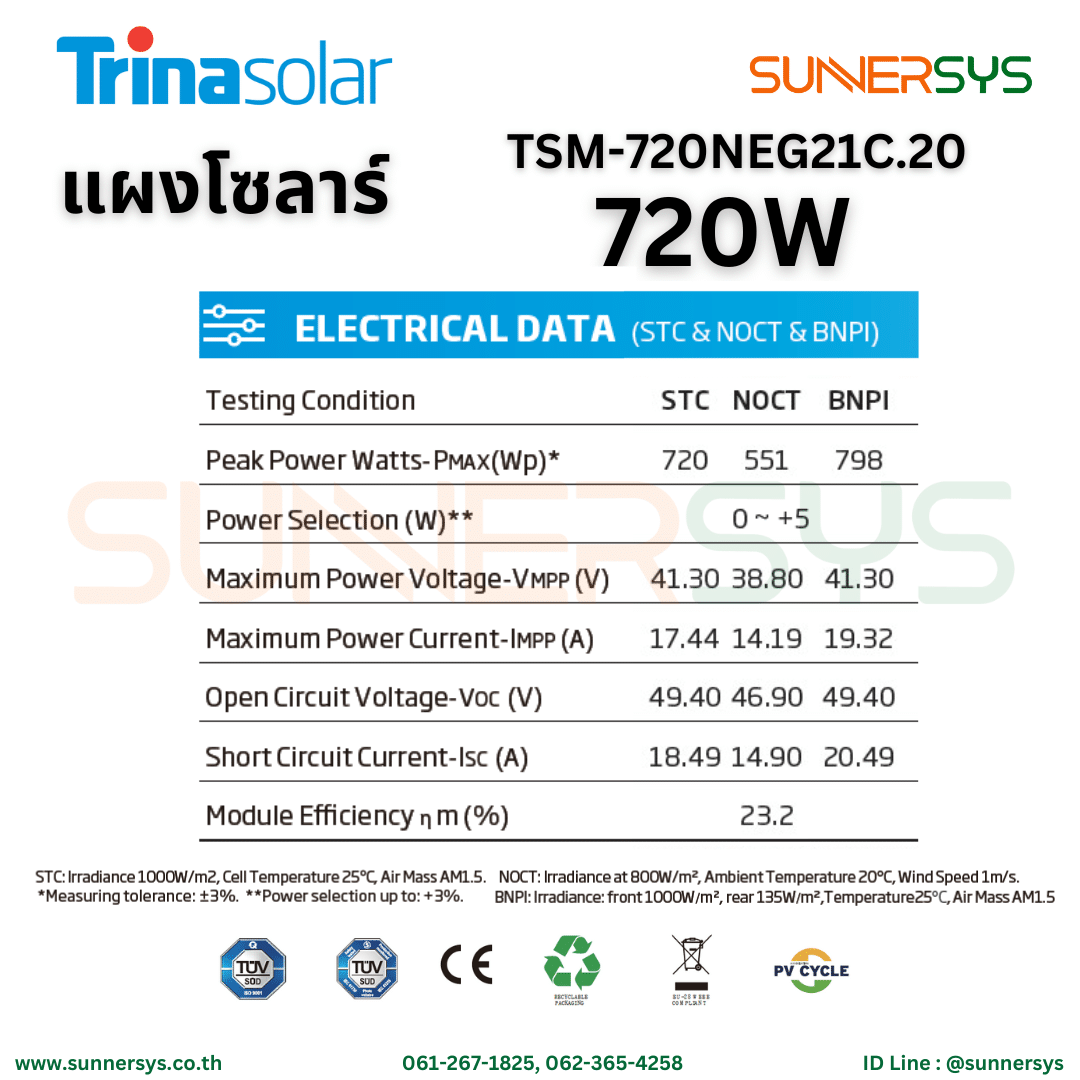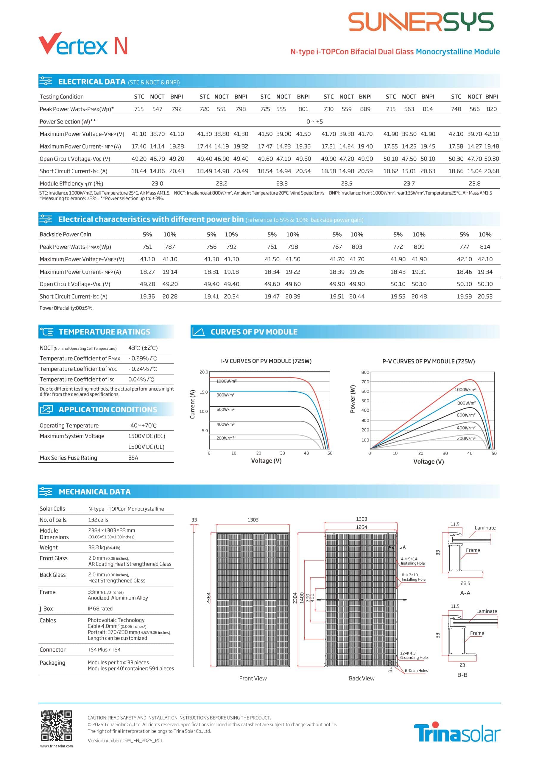 - เทคโนโลยีเซลล์: N-type โมโนคริสตัลไลน์ i-TOPCon, กระจกคู่แบบผลิตไฟฟ้าสองด้าน